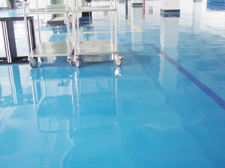 待中涂固化后,用打磨机全面研磨平整后清除干净,使中涂基面平整、光滑。将面涂材料调配搅拌后用镘刀均匀镘涂于中涂之上,形成一道防尘、防腐、耐磨、光洁、亮丽的自流平表层。